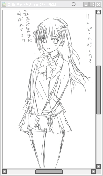 らくがきばかりで、色塗ってません。進めないと、、。りんちゃん高校生ばーじょんです。先生はやっぱり殺生丸です。つみかさんの小説に影響しているので、これから何処かの教室に行くところです。^m^