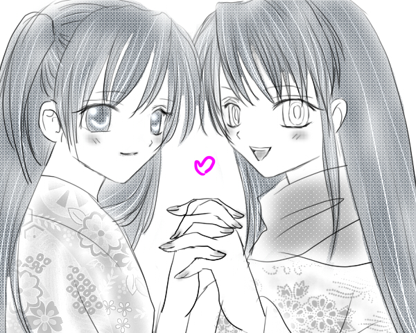 よく分かりませんが、コーヒーに浸ったってしまったintuos(タブレット)が動いたので急いでお絵かきしました。”つらら”とりんちゃんvこの二人の好きな男性タイプは似ていますよね。女の子同士だから相性バツグンな気がしますv二人ともロングヘアーの黒髪でかわゆいです~vv